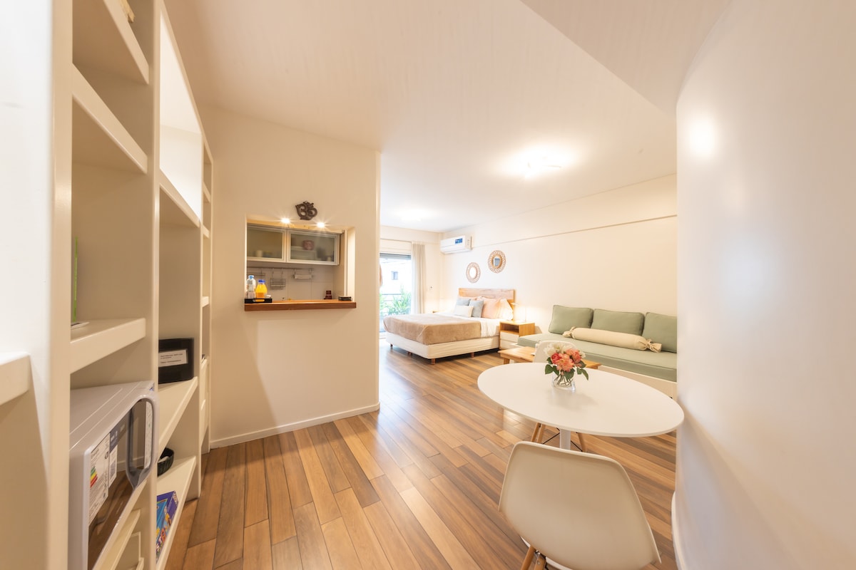 Amplio monoambiente, con cocina separada, totalmente remodelado con todo el estilo y las comodidades en la mejor ubicación de Buenos Aires. Frente al Alto Palermo shopping, cerca de parques, principales avenidas y subte . Cama dos plazas, Smart TV, baño completo con bidet, ducha y secador de pelo, cocina con Heladera y Freezer, tostadora, cafetera y microondas con grill. Cortina blackout automáticas con control remoto. Aire acondicionado Frío Calor.