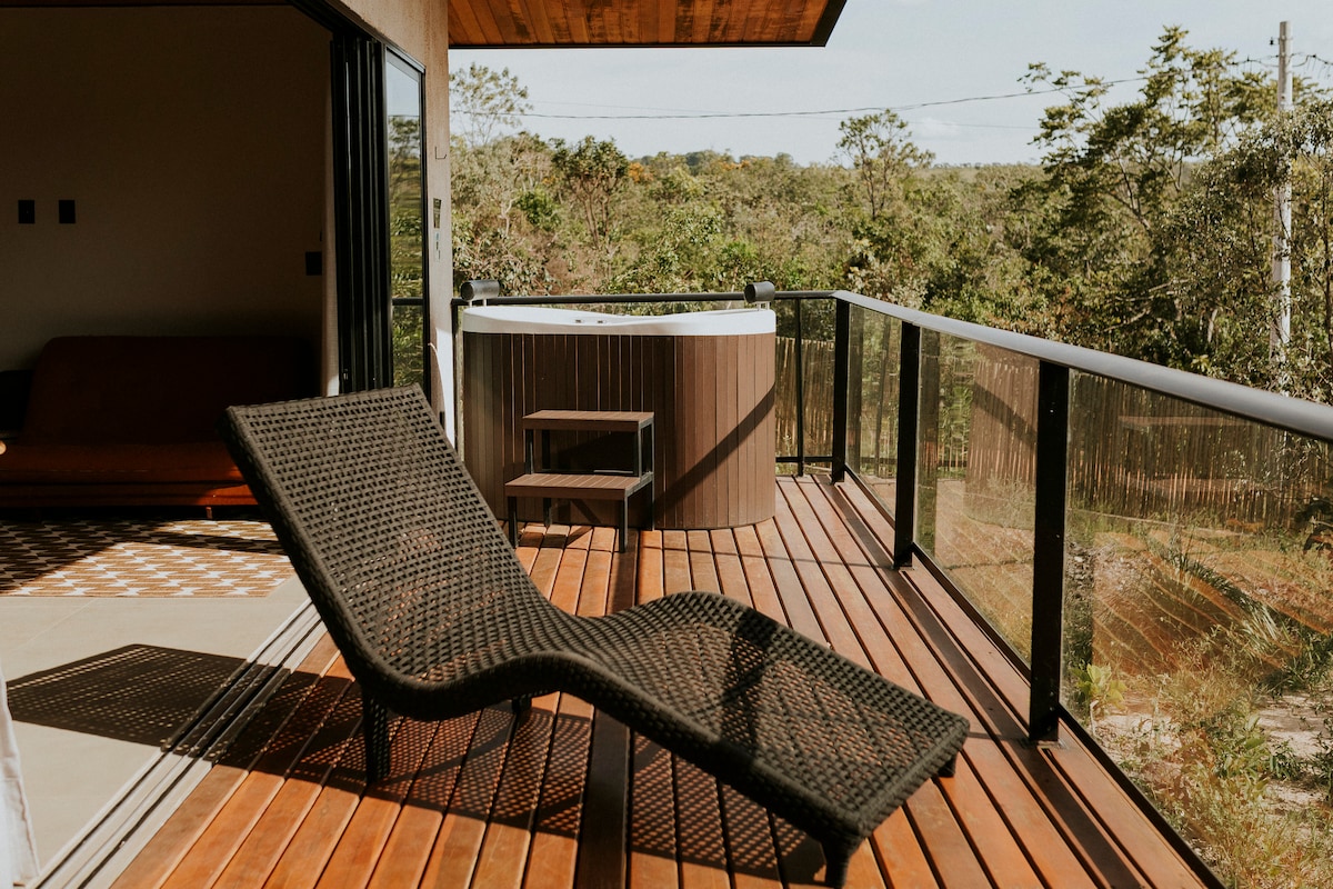在森林中,玻璃和木材製成的溫馨私人小屋,四周環繞著純淨的水域和豐富的自然景觀。 位於一個非常特別的村莊,磨坊,距離上天堂(Alto Paraíso)12公里(土路),這裡是一個迷人的旅遊景點,天使和大天使瀑布。 住宿的建造優先考慮舒適性和隱私。 非常適合情侶入住。除了陽臺上的按摩浴缸外,房客還可以在距離平房僅50公尺的露臺上享受河流浴和日光浴。