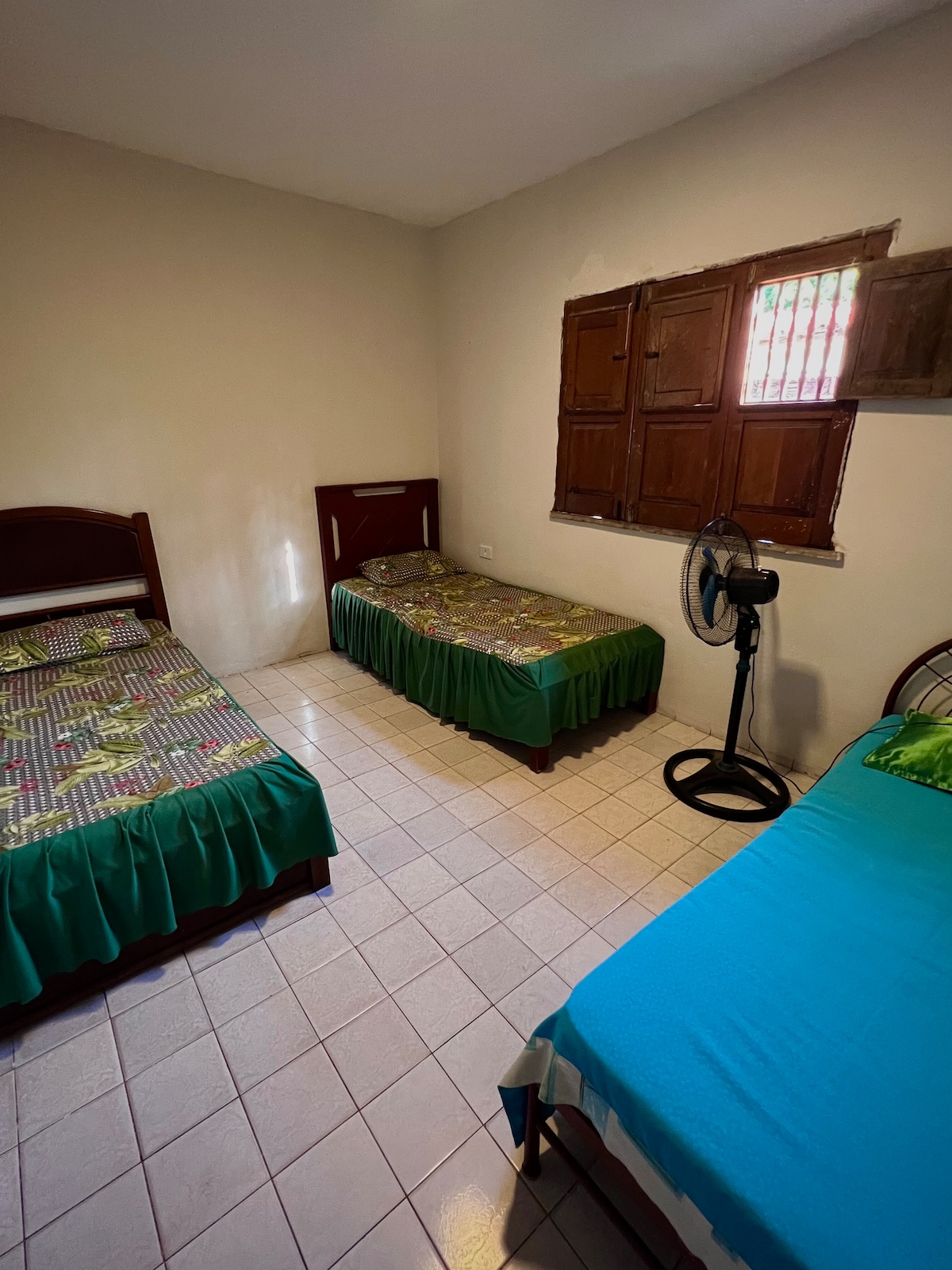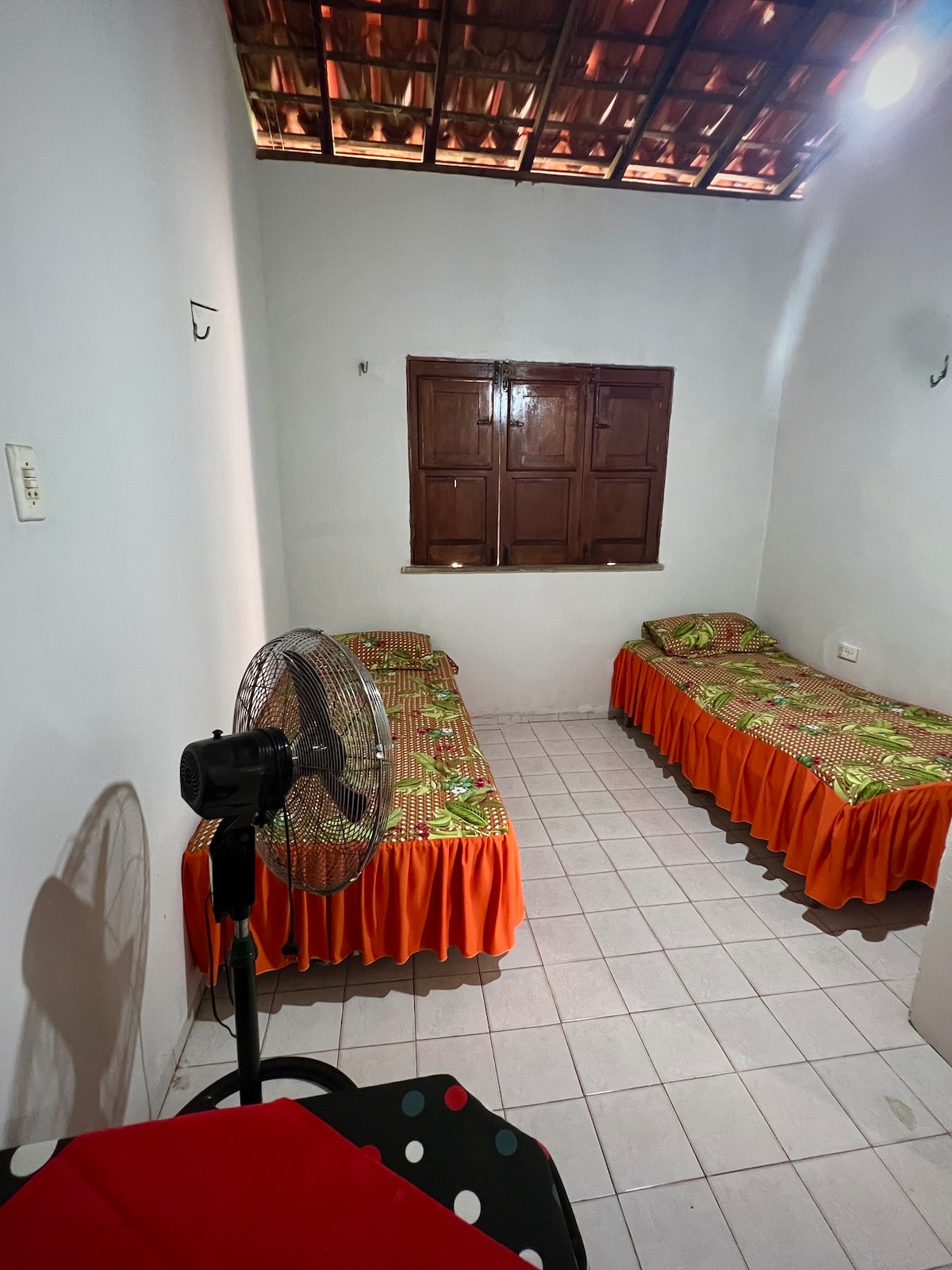 O quarto acomoda até 2 pessoas, com 2 camas de solteiro, ventilador, Wi-Fi e mesa de apoio.