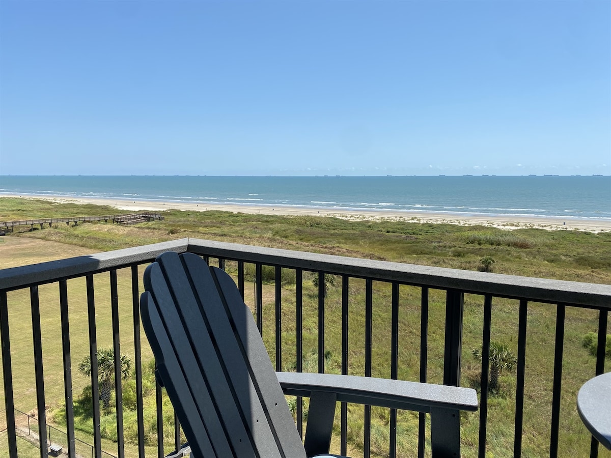 This beloved beachfront corner studio condo between Stewart Beach and East Beach has a large balcony and expansive gulf views. It is well-appointed for two or for a solo retreat. Resort offers pool and pickleball! No street to cross to get to the beach, yet the condo is close to downtown Galveston and the Seawall. Enjoy the gorgeous sunrises and moon gazing, track cruise ship comings-and-goings, check out the activity on the beach, float in the heated pool, or relax and watch the waves!