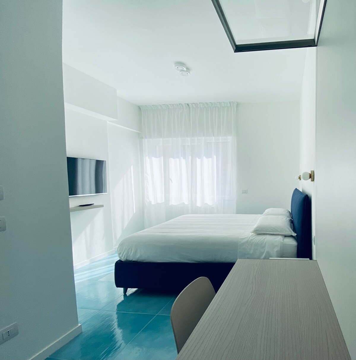 雙人海景臥室(可要求加 1 張單人床) 面積:20 平方公尺(215 平方英尺 無需離開房間,即可潛入阿瑪菲海岸的藍色海洋。從這間舒適的臥室眺望,您將無言以對,這是與特殊人士分享的完美體驗。它配有地中海風格的家具,並配有來自維耶特里蘇瑪雷 (Vietri sul Mare) 的手繪瓷磚的華麗地板。 這間臥室非常適合情侶入住第三位房客時,我們也可以加床。