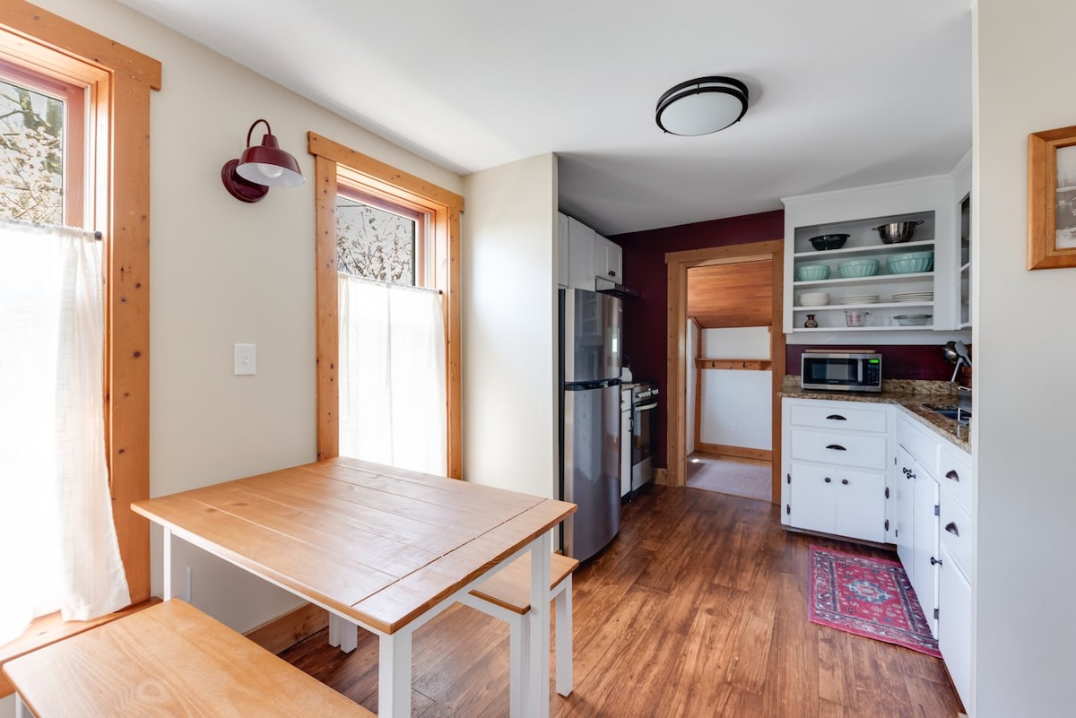 Wake up to a view of a 19th-century gristmill right outside your window — then walk across the street to explore it. The Rock Mill Farmhouse is a thoughtfully renovated 1846 home that was once the dwelling of the mill's keeper, and it still carries that history in every room: exposed original siding and beams, a winding staircase, an original A-frame ceiling in the upstairs bedroom, and a few charmingly low doorways that keep tall guests humble.
