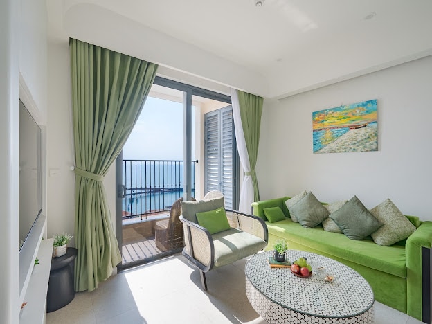 ✔ Fully Equipped – Comfy beds, equipped kitchen, fridge, WiFi, washing machine and air conditioning. Free gym and pool. ✔ Ocean & Fireworks Views – Enjoy the sea by day and dazzling fireworks at night. ✔ Prime Location – 8 minute walk to the beach, ~10 minute walk to Hòn Thơm cable car station, ~5 minute car ride to Khem Beach.