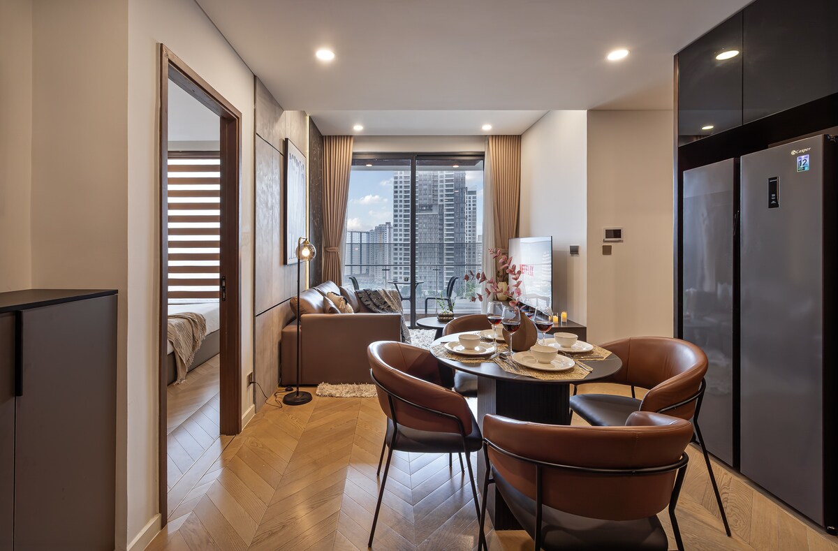 Please be advised that there is ongoing construction in the surrounding area. While the work does not affect access or the quality of the apartment, some daytime noise may be audible. You will feel relaxed in this calm and stylish space. There are many convenience stores, restaurants, and coffee shops nearby, along with access to infinity pool and gym. 15 mins to reach Thao Dien This 1-BR condo has beautiful city view 1 bedroom 1 bathroom Kitchen and living room Smart TV with Netflix function