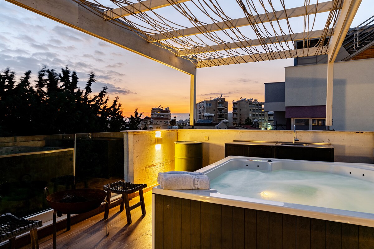 Contemporary 2 Bed Apartment 1.6km from the sea in Linopetra, Limassol. You have a private rooftop terrace with jacuzzi! The rooftop is fitted with BBQ, fire pit, washbasin, lounge and dining area with a view over the city. There are 2 double bedrooms, 2 bathrooms, modern fully equipped kitchen with dining, covered balcony, AWESOME sofa with extending mechanism. Enjoy Nespresso, the Smart TV. Please note there is construction ongoing going across the road, which can start early due to the heat.