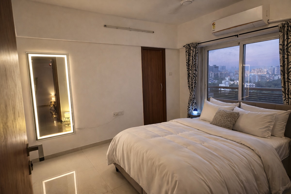 在這間美麗寬敞的 2 臥室公寓中,體驗奢華與舒適的完美融合。這間公寓非常適合商務旅客和BKC的遊客,每扇窗戶都能欣賞到美麗的樹木景觀,讓您在這座不夜城中享受寧靜的度假勝地。 這個現代天堂位於市中心,讓您在探索孟買時享受放鬆的環境。 公寓: - 距離國內和國際機場 8 分鐘
