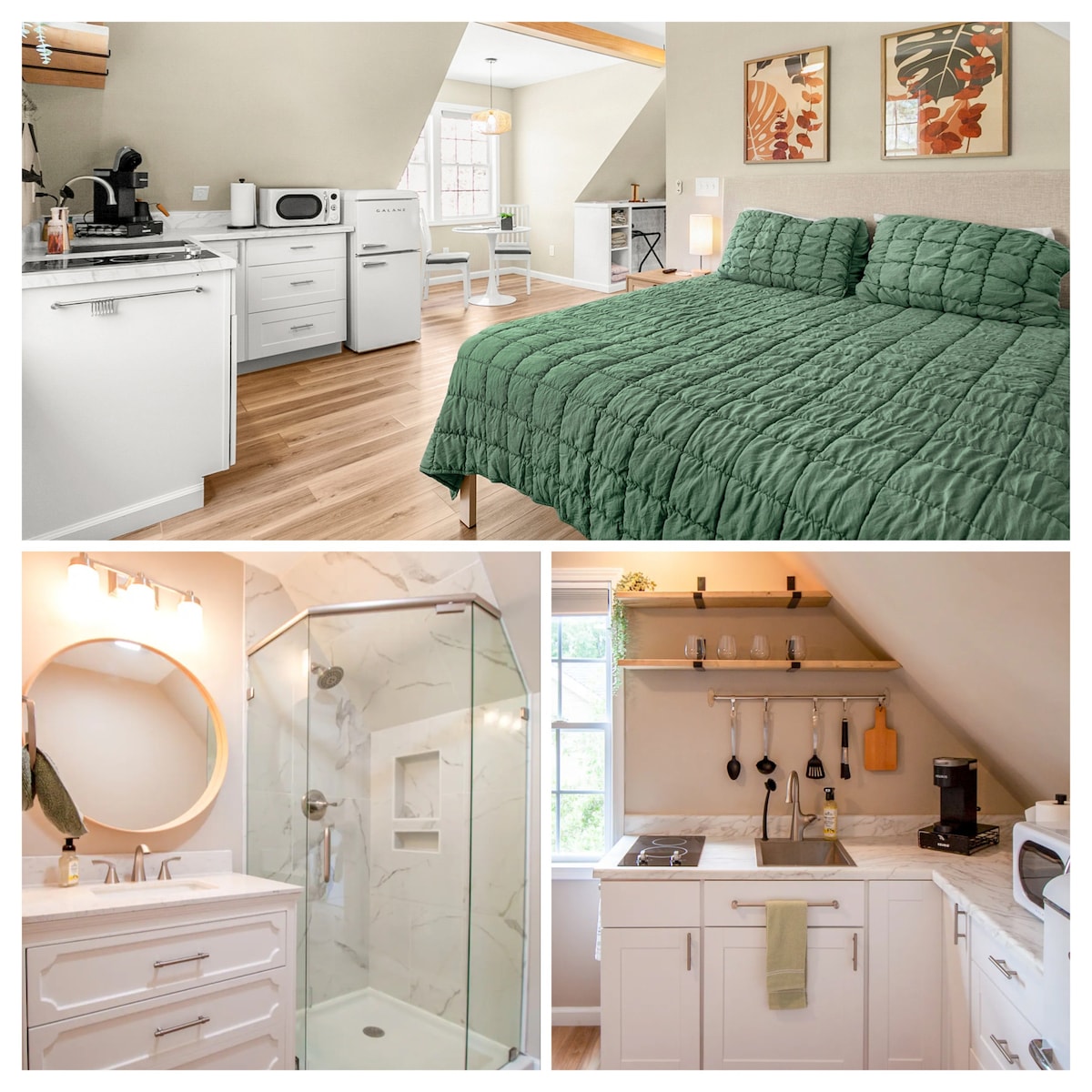 全新、私密和安靜的殖民馬車房,俯瞰歷史悠久的Fuquay-Varina市中心的公園。 步行半英裏即可抵達Fuquay和Varina鎮中心,輕鬆前往餐廳、啤酒廠和精品店。 廚房配備全套冰箱、微波爐、烤麵包機、水槽、2個爐竈、配有牛奶起泡器的Keurig、咖啡和茶用品、烹飪用具、湯鍋、平底鍋、銀器、早餐桌和椅子。 我們的房源配有1.8公尺寬雙人牀、古董高男孩梳妝臺、橡木搖椅、沙發和電視