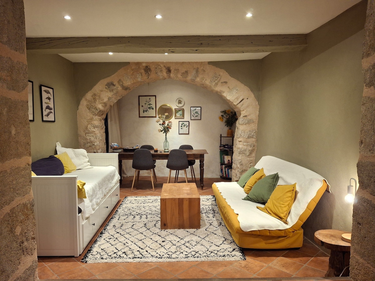64 平方公尺的公寓,位於村莊的房屋中,可俯俯瞰埃羅葡萄園和峽谷。 靠近村中心。 一段略陡的樓梯通往一個大客廳,客廳通往一個大陽臺/露臺,露臺面朝東,設有落地窗,俯瞰花園和葡萄園,景觀美麗開闊。 客廳區(沙發床)、用餐區和開放式廚房。同一樓層,臥室(160 厘米雙人床)和浴室淋浴/廁所。 可使用 Résa Cybevasion 和 LBC 服務