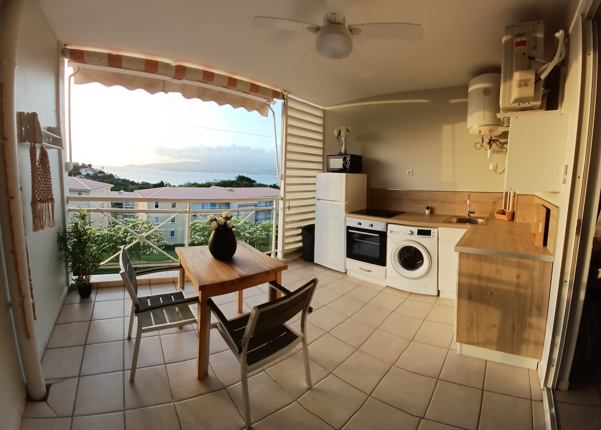 安全住宅「Le Domaine des Tuileries」,安靜,距離Anse Mitan海灘300公尺,距離Pointe du Bout步行5分鐘。 翻新的單間公寓,寬敞舒適,優質的雙人寢具,空調,更衣室。 全景海景露臺,配有設備齊全的廚房。 獨立浴室,配有淋浴間、洗手臺、馬桶。 我們提供牀單和浴巾。 不限流量的橙色WiFi網路+橙色電視。 免費私人停車位。