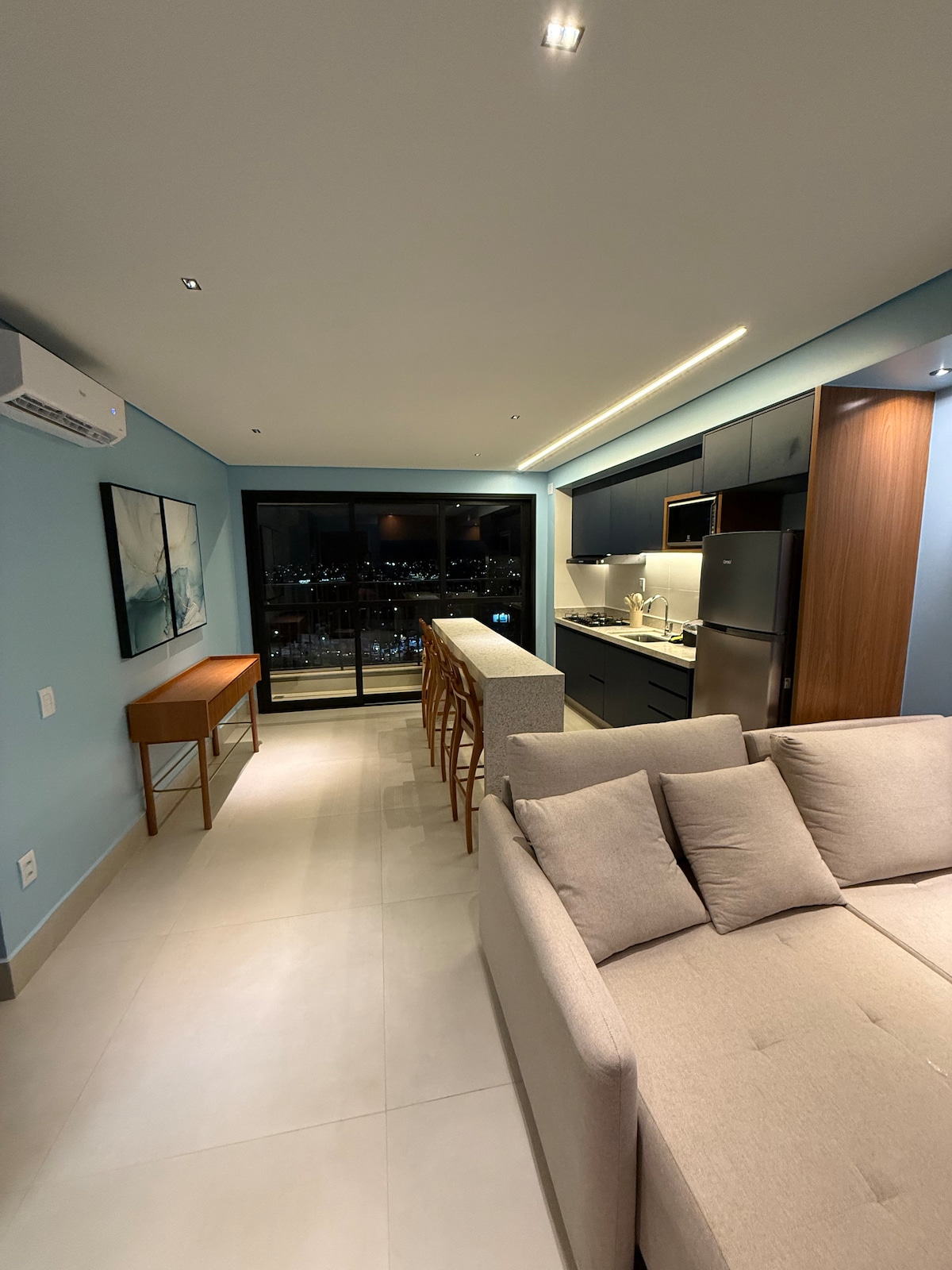 Stay in the best part of the Marista district, with a pool inside the apartment. Premium location, just steps from the best bars, restaurants, boutiques, cafes and Ricardo Paranhos Street. On the 34th floor, enjoy the pool with an incredible view. This high-end apartment combines modern design with a sophisticated urban vibe, featuring exclusive art by the artist Selon. It offers comfort in every detail, with quality furniture, elegant finishes and a large, cozy sofa.
