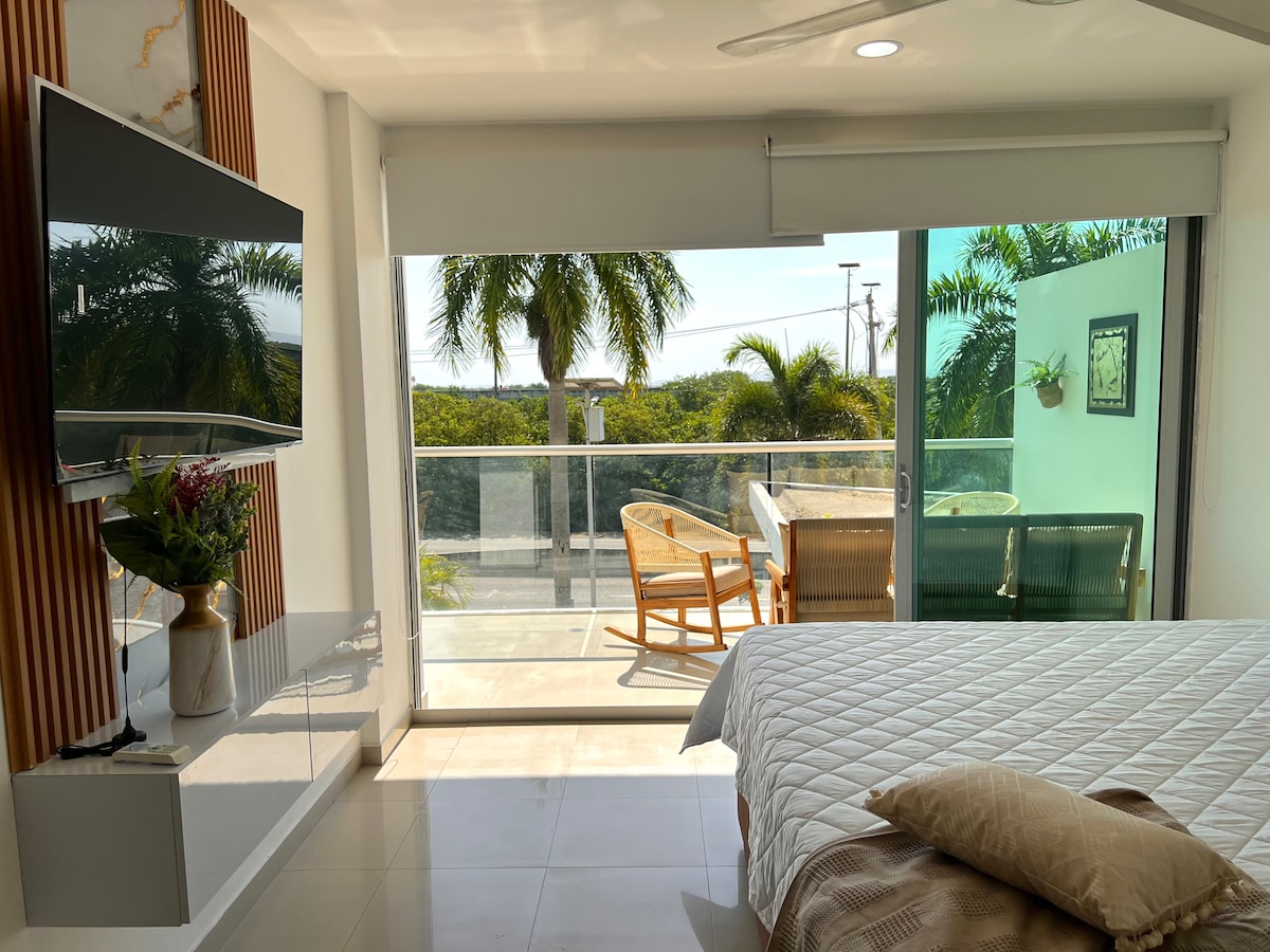 位於卡塔赫納北部海灘區的Morros Ultra浪漫舒適的1間臥室,靠近舊城區和機場。 以柔和的白色和藍色裝飾,配有加大雙人床、2間全功能浴室、全功能廚房和Wi-Fi。 沙發床可多睡2人,但非常適合情侶入住。 享受3個無邊際泳池、桑拿房、健身房、24小時保安和直達海灘。 非常適合放鬆度假、海邊工作或時尚的海岸住宿,充滿光線、平靜和魅力。