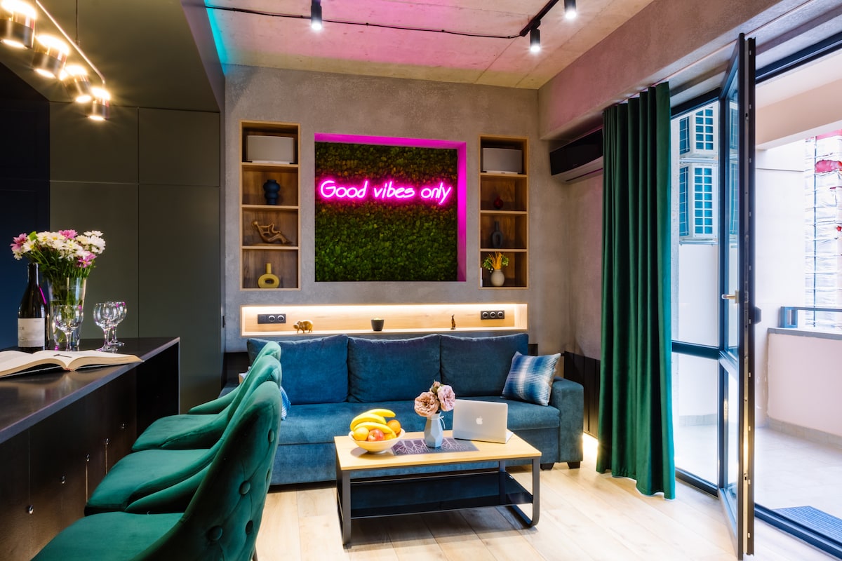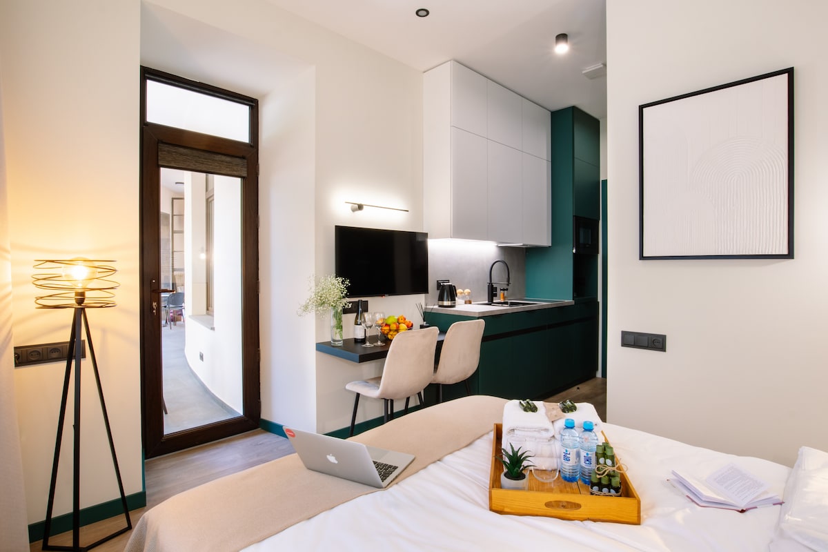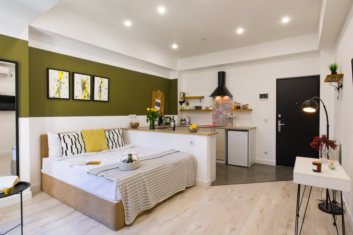 入住這間位處中心地段的單間公寓,可入住 4 位房客,享受這裡的時尚體驗。地理位置極佳,方便您長途或短途旅行所需的一切。客廳和用餐區配有沙發床、廚房配有電器,包括微波爐和咖啡機、配有雙人床的臥室、浴室和陽臺。 您的健康是我們的首要任務。我們的房源遵循深度清潔規則,並採用專業清潔策略消毒。 祝你住宿愉快!