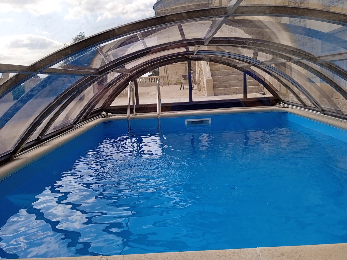 Dans la partie rénovée d'un château datant du XVIème siècle, notre gîte très confortable vous permettra de passer un séjour inoubliable en famille ou avec des amis. Max 26 personnes. Au RDC : la vaste salle à manger, la cuisine équipée, un WC, une chambre accessible PMR avec SDB et WC et la piscine chauffée. Au 1er étage : un espace jeux et 6 chambres avec SDB et WC. Au 2ème étage : 6 chambres/5 SDB et WC Le logement entier est pour vous, vous ne partagez que le parking et la cour.