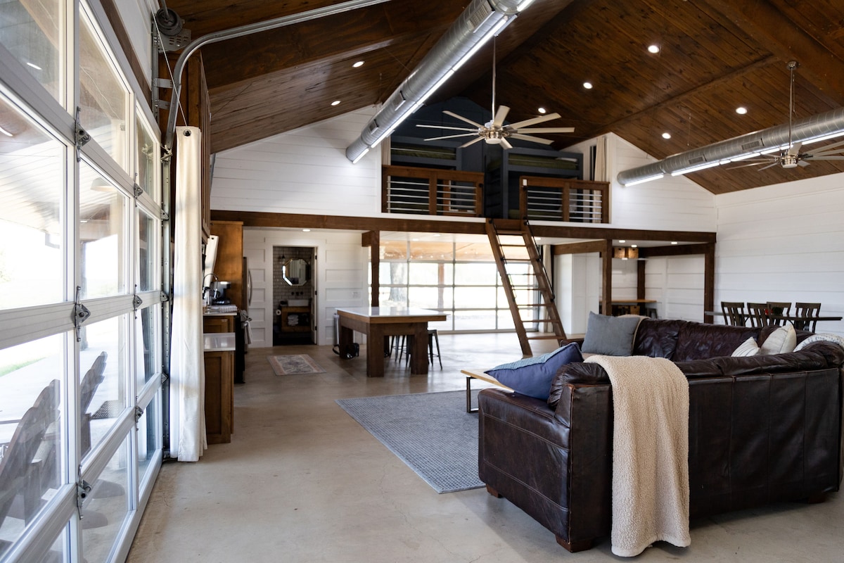 Large luxurious barndominium in a beautiful country setting right outside of the city limits. This 2,400 sqft space is open concept with full kitchen, one full size bathroom, living area, dining table, washer/dryer, ping pong table and sleeping loft. The loft has two twin size bunk beds and two private queen size bedrooms off to either side. This property is shared with two other Airbnb rentable units with a large private pond down below with shared dock. No parties over 10 guests allowed.