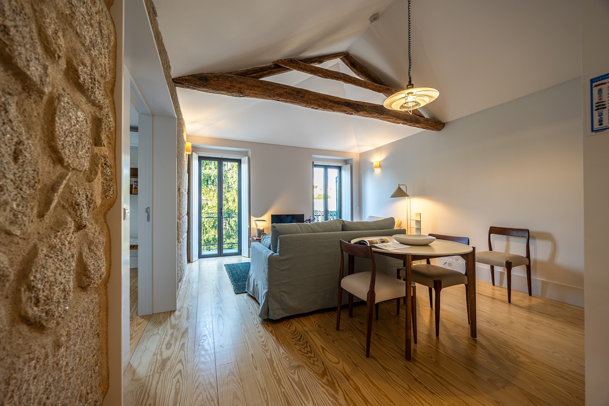 Stay in a stylish one-bedroom apartment in a historic Porto building, just steps from Clérigos Tower and Cordoaria and Virtudes Gardens. Enjoy a balcony with sweeping views over the Douro River - perfect for relaxing after a day of exploring. Like many heritage buildings, there’s no lift and a unique 0.5 bathroom design (private toilet + open sink & shower), adding to its charm. Surrounded by cafés, shops and landmarks it’s the perfect setting for friends and couples to fall in love with Porto.