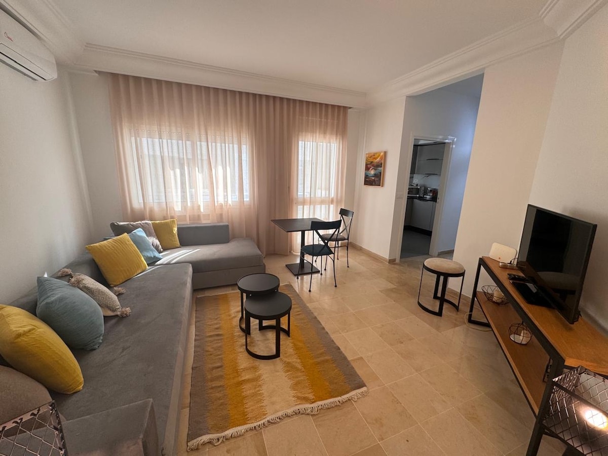 在這個安靜舒適的住所放鬆身心,設備豪華,裝飾和諧,確保您有一個愉快的住宿體驗。 公寓位於安靜的住宅區,包括一間帶沙發床的客廳、一間帶陽臺的臥室和一個設備齊全的小廚房。 📍靠近所有便利設施:家樂福、餐廳、咖啡廳、酒吧、健身房、藥局等。 距離突尼斯迦太基機場 5 分鐘。