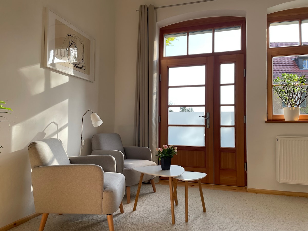 公寓設有露臺,位於我們的三面庭院。 您有一間獨立公寓/40 平方公尺。 2 張床寬 1 公尺長 2 公尺,1 張沙發床寬 2 公尺長 2 公尺,作為第 3 張床非常舒適。 在 Seußlitz 的葡萄園徒步旅行,夏天在 Goltzscha 天然泳池放鬆身心,並使用距離僅 400 公尺的易北河自行車道 讓你想要更多。 免費提供停車位和2輛自行車。您自己的自行車在我們的庭院中是安全的。