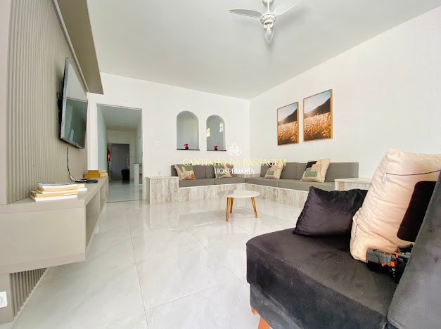 This fully equipped home, located across from Praia Grande, Arraial do Cabo is in a secure gated community. The house offers Wi-FI for streaming and a Smart TV with live channels, three bedrooms, including a master suite with a private bathroom, plus an additional full bathroom and a half bath. All bedrooms have air conditioning. A private patio with barbecue grill, as well as community swimming pool, sauna on weekends, and children park. About 3 hours(163km) from Rio de Janeiro.