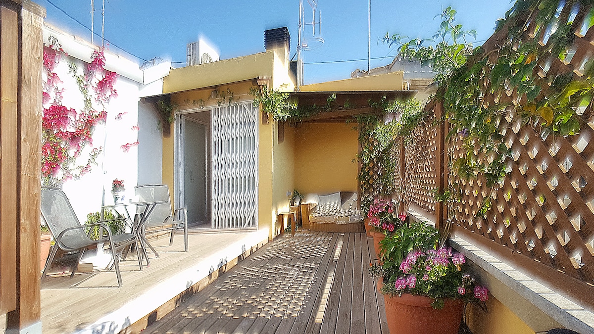 重要公告;禁止任何活動或派對。 位於瓦倫西亞市中心的夢幻頂層公寓。乘坐巴士和地鐵前往海灘非常方便。 私人露臺,可欣賞城市美景。 全包:WiFi、空調、床單和毛巾!! 公寓附近有公共停車位(24小時約20歐元) 旅遊住宿登記號碼:VT-38165-V