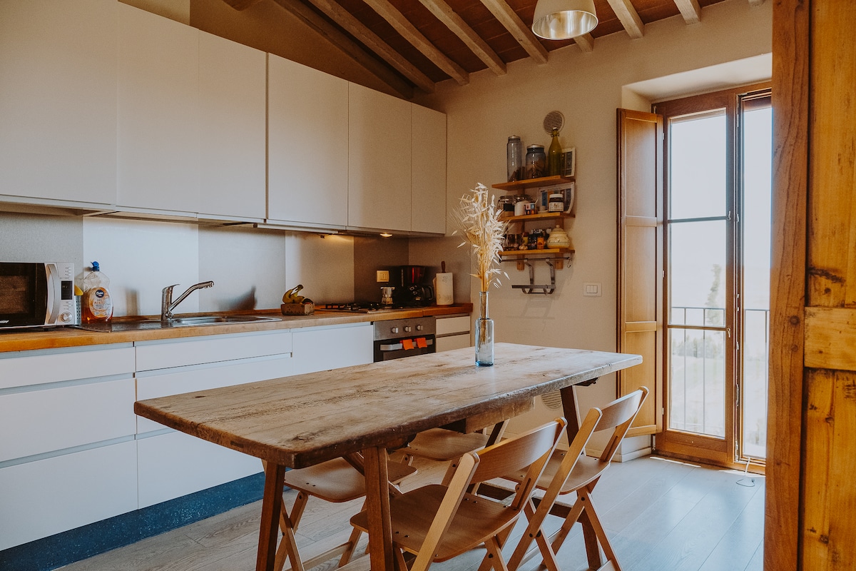 您位於Pienza和Montepulciano之間的私人托斯卡納度假勝地。 寬敞的100平方公尺公寓,可供兩人入住,獨享專屬通道、大型私人花園和奧爾恰山谷的迷人景色。 優雅、平靜且真實,只有你和托斯卡尼。
