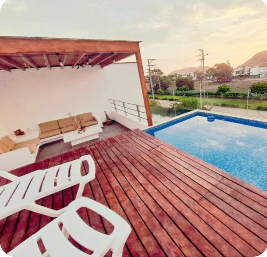 Solo para familias. A 8 minutos del Boulevar de Asia. Solo se permiten 14 personas. La casa cuenta con 5 cuartos, 6 baños, terraza en el 3er piso con pequeña piscina, sol y sombra y zona de parrilla. Cocina, horno, refrigeradora, terma, lavadora, televisores con cable y artefactos eléctricos. Estacionamiento propio. Estacionamiento para invitados dentro del condominio sujeto a disponibilidad. No están permitidas las mascotas. Incluye sábanas. No incluye toallas, jabón, champú o detergente.
