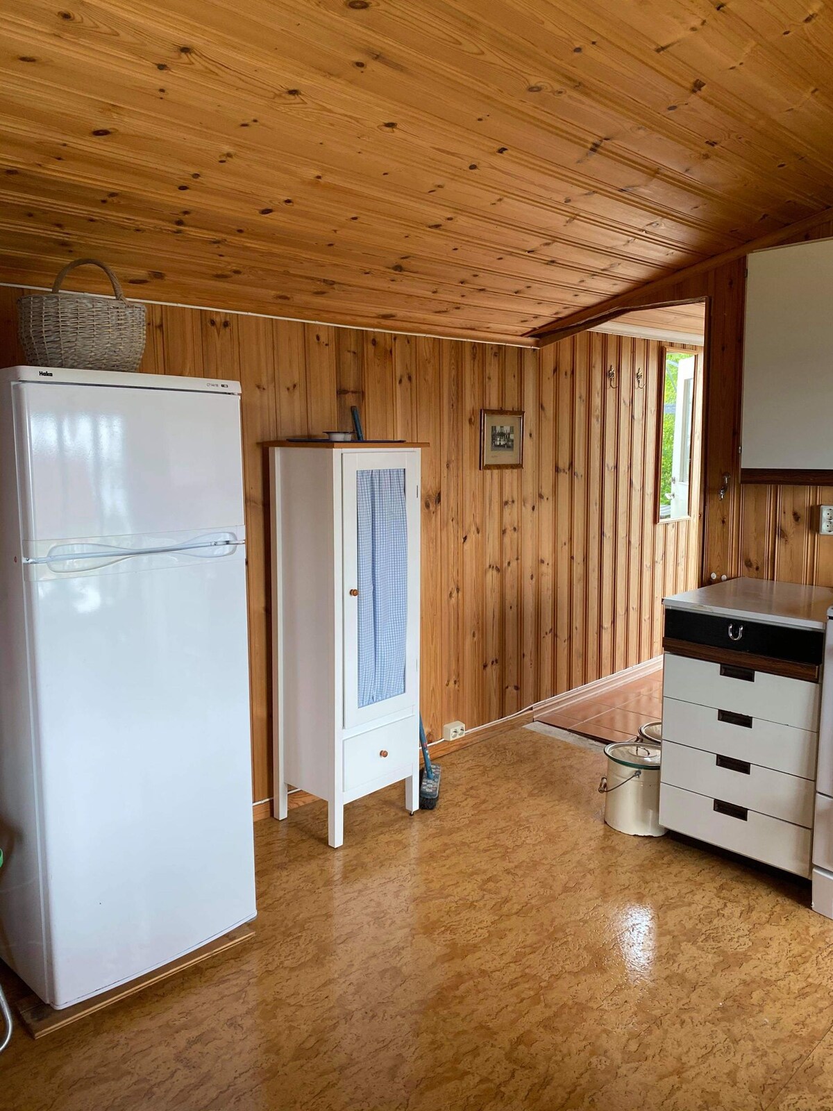 Cosy cabin with a great view. 200 meters to the nearest beach and 800 meters to a big public beach. Sun from 8 am to 10 pm in the summer. Large terrace on three levels. Kitchen holds a modern standard. Main cabin holds to bedrooms (one with a double bed and one with a single bed), living room, dining area (with a kitchen sofa that can be made in to a double bed) and kitchen. Second cabin is the bathroom and third cabin is a bedroom. Note: The third cabin is without electricity.