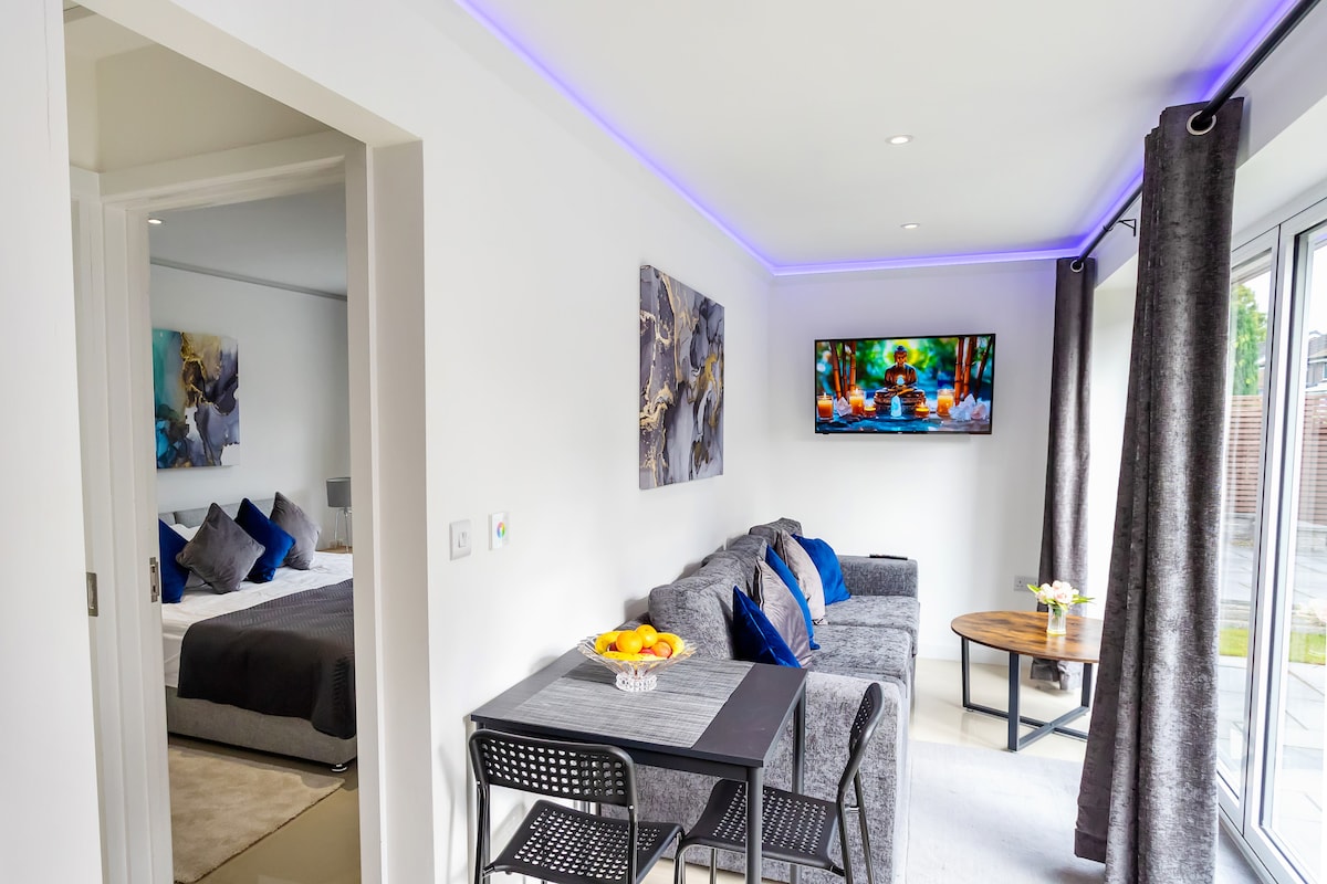 寬敞的休息室,配有雙人床和大型皮革沙發、椅子。高畫質電視和Bose藍牙音樂喇叭。單間公寓是獨立的,與主屋完全分開。擁有配備水槽、冰箱、雙熱板和微波爐的小廚房。淋浴間和廁所,配有洗手盆。單間公寓距離市中心10分鐘巴士車程,但位於安靜的綠葉區域,步行5分鐘即可抵達Wollaton Park。為房客提供私人路邊停車位,就在單間公寓入口旁。