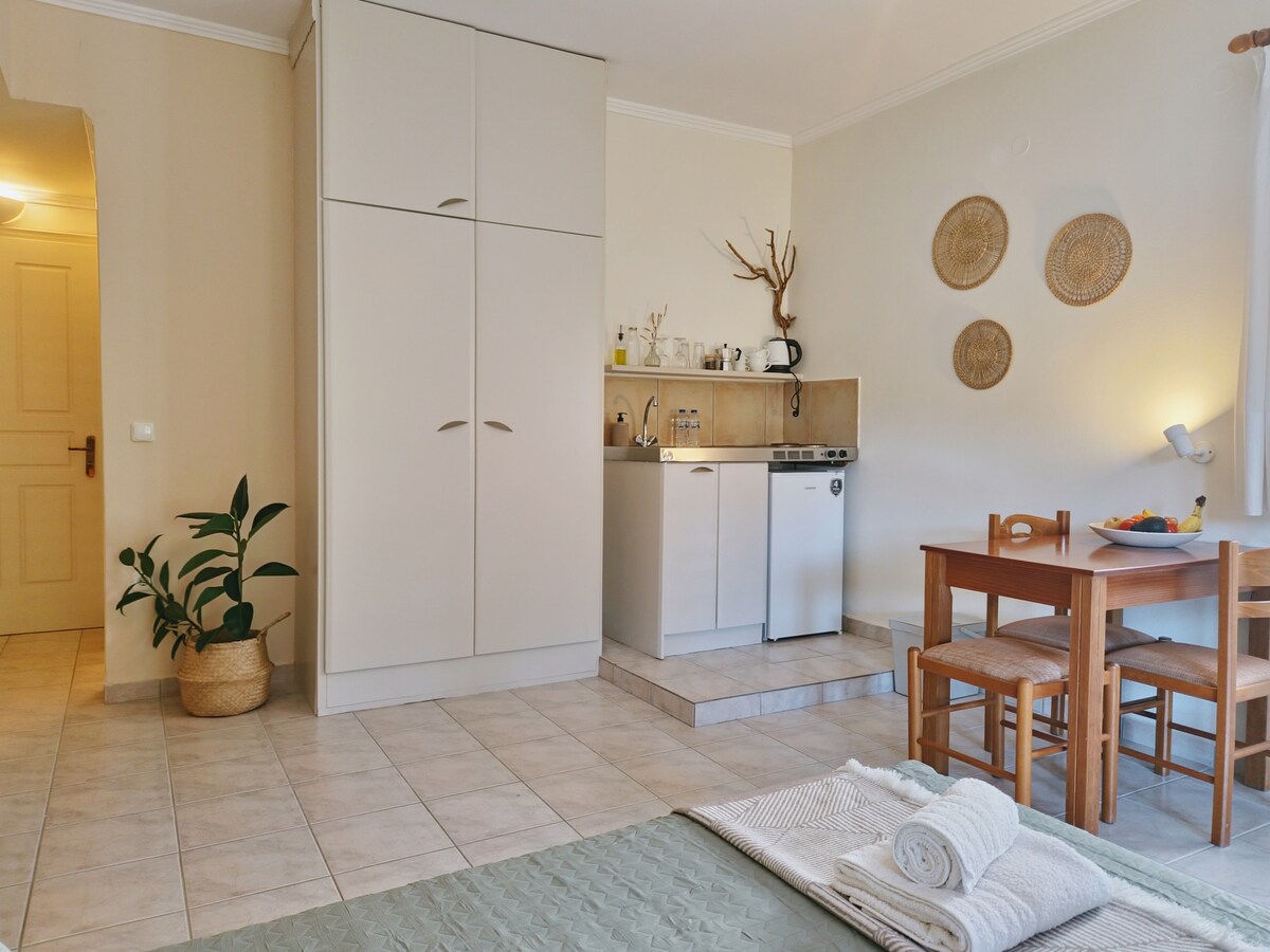 Escape the summer heat and enjoy the fresh mountain air of Lefkada, where temperatures are often a few degrees cooler than the busy coastal towns below. This charming and secluded studio for two offers a peaceful stay, surrounded by the beautiful mountains of Lefkada and the tranquility of Pinakochori. Enjoy full flexibility with our contactless check-in: no need to meet in person or set a time — arrive whenever it suits you and let yourself in easily.