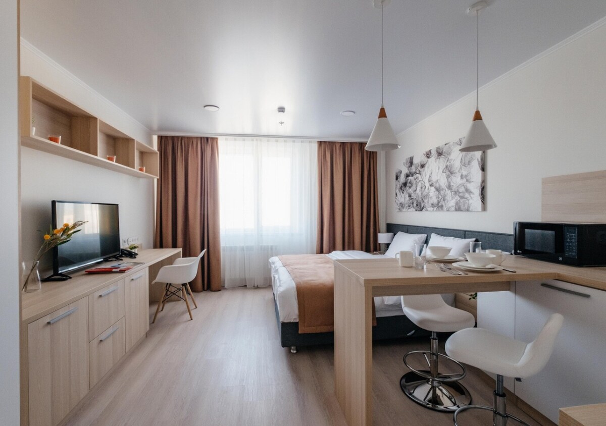 探索阿斯塔納市中心的舒適! 歡迎來到您的家外之家—一個時尚的1間臥室公寓,距離城市的主要景點僅幾分鐘路程。 您會喜歡的體驗: •舒適的牀,配有乾淨的牀單 •高速Wi-Fi和智慧電視 •設備精良的廚房+用餐區域 • 安靜的環境:植物園和公園 • 步行即可抵達商店和公共交通工具 •輕鬆前往阿斯塔納競技場、巴雷斯競技場和其他體育設施。 預訂住宿,享受旅程!