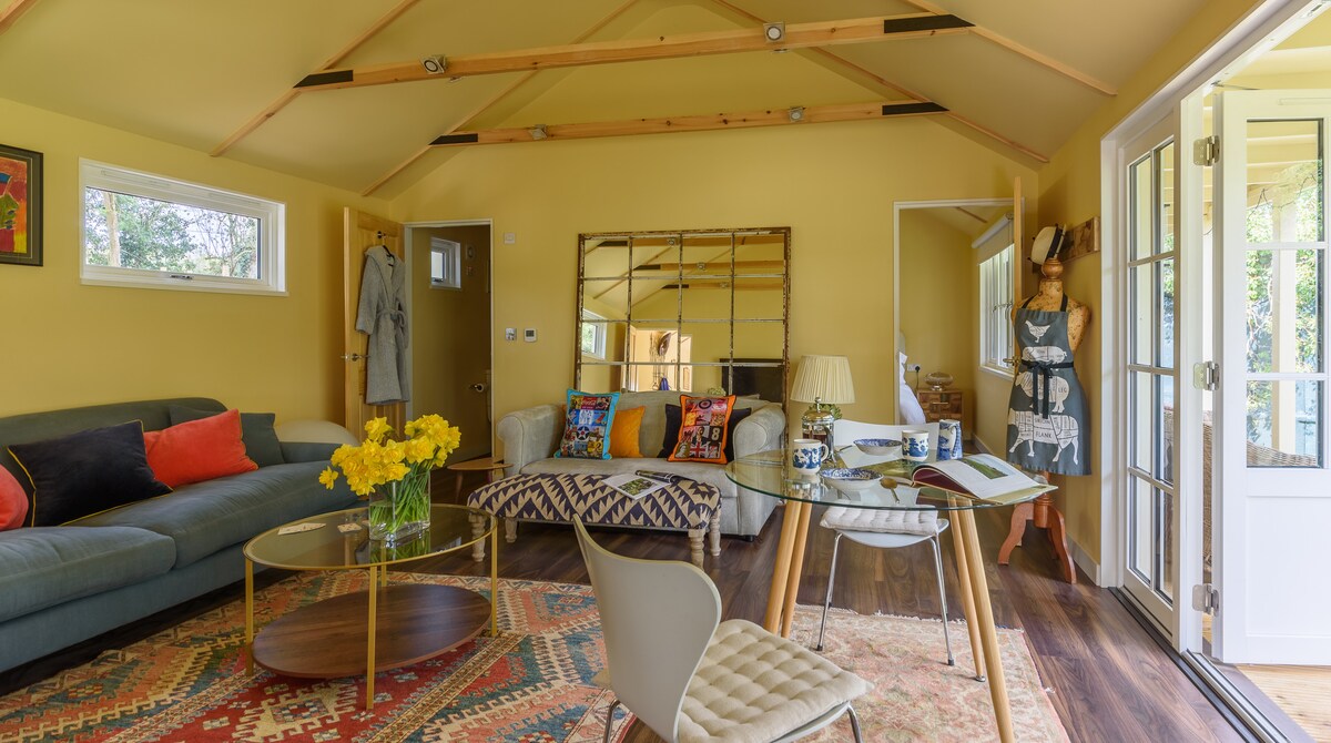 寬敞的單臥室附屬建築,有自己的廚房和淋浴間。通過自己的門(小心頭部!)進入一個小入口大廳,通往廚房區域、淋浴間,然後進入一個朝南的大臥室,有高高的天花板和大窗戶,俯瞰主屋的前草坪。在舒適的沙發上放鬆身心,或在餐桌上享用美食。設備齊全,適合短期或長期住宿。步行20分鐘穿過田野即可抵達The Farmer 's Dog酒吧。