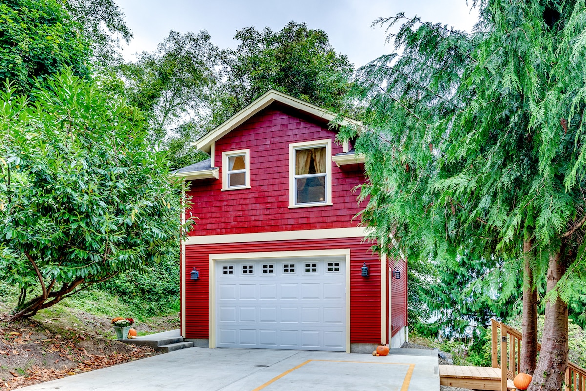 坐落在山丘上,私人美麗的現場藝術空間,可俯瞰哥倫比亞河,可欣賞大海美景。 通風、開放、Loft w. 2 間臥室套房。 單間公寓、洗衣房、露台、房子下方的院子/露台,距離市中心和河流4個街區。從街道到房子有35階樓梯! 至少兩晚。預訂需要簡短的個人資料。 由於生活工作問題,我只能提前6個月預訂,但您可以傳送訊息給我,以便加入等候名單。