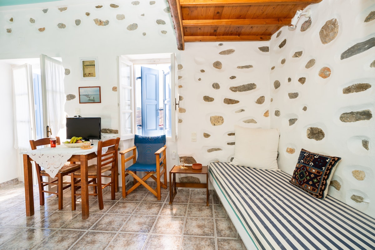 Άνετο στούντιο με εξοπλισμένη κουζίνα, μπάνιο και ιδιωτικό μπαλκόνι. Ιδανικό για ζευγάρια ή δύο φίλους που θέλουν να περάσουν τις διακοπές τους στη μαγευτική Αστυπάλαια. Απέχει μόλις 300m από την Χώρα και 10' με τα πόδια από το λιμάνι. Τέλος, σε απόσταση αναπνοής υπάρχουν σουπερ μαρκετ, τράπεζες, φαρμακείο, καφετέριες και φούρνος.