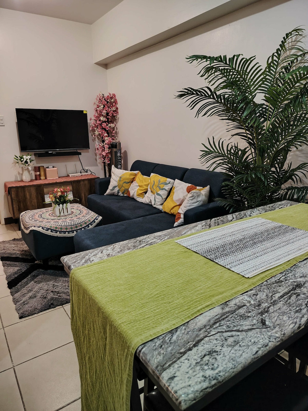 Curl up and sleep on a comfortable bed. Binge on Netflix with a 64-inch TV while stretched out on a recliner. Catch up on your digital deliverables with available internet (50 Mbps). A homey place to Rest-Relax-Work-Repeat. Check in earlier than usual, check out later than usual. Located at SMDC Blue Residences, our space is close to Ateneo, the Katipunan LRT station, the jeepney terminal to UP, a convenience store, a pharmacy, a laundry service place, a spa, an AF gym, and dining options.