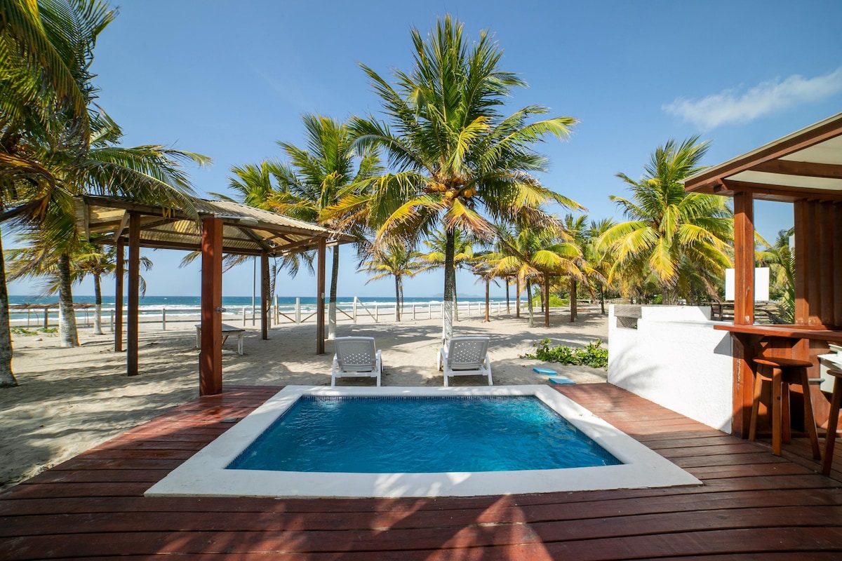 整套別墅位於二樓,四周環繞著熱帶環境,距離海灘僅20公尺。 非常適合與親友一起放鬆和享受。 位於私人綜合大樓內,配有獨家泳池、燒烤區和額外的共用泳池。 在海邊放鬆身心的理想環境。 包括每日清潔服務,最多可容納 10 位房客(包括兒童),並配備發電機,提供水、照明和一些電源插座。