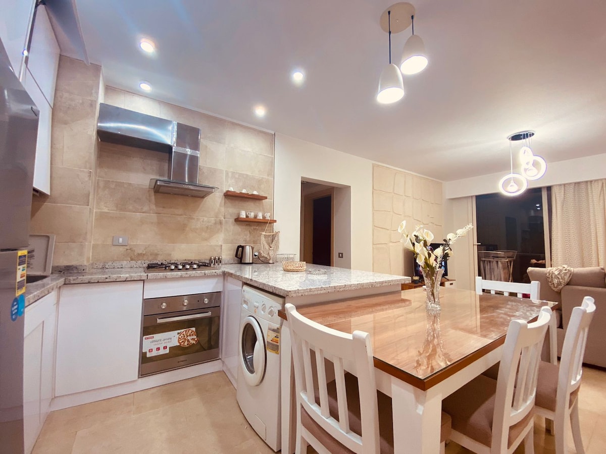 A Stylish 3BR Retreat Just 60 Minutes from New Cairo. Effortless Water Access: Enjoy easy, direct access to both the crystal-clear lagoon and the pristine beach. Spacious Comfort: 3 Bedrooms (including a private Master Suite) and 2 clean, modern bathrooms. Fully Equipped for Living: An open-concept kitchen with all modern appliances, plus a dedicated dining area and a cozy living room. Modern Essentials: Stay cool and connected with full Air Conditioning, High-Speed Internet, and TV.