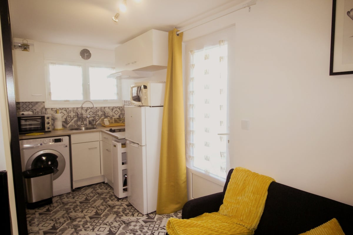在這個寧靜的中心空間簡化您的生活。 漂亮的單間公寓,位於安全住宅的一樓,有陽臺和兩個停車位(住宅內)。 舒適的客廳,可轉換沙發、全功能廚房和WiFi。 靠近奧伯根維爾市中心 步行10分鐘即可抵達Flins商店,從Aubergenville-Elisabethville火車站乘坐巴士8分鐘即可抵達。