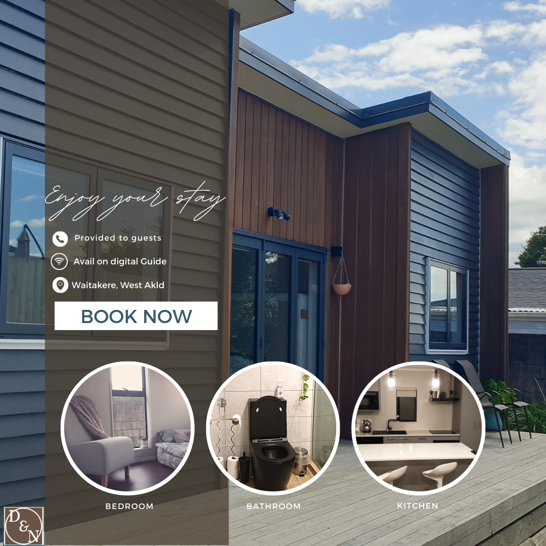 這個獨特的獨立式小屋,配有斜頂,是一個私人的、溫馨的空間,非常適合一個人或一對夫婦。它有一個小型私人圍欄庭院,前面有一個專用的免費停車位。 設備齊全的廚房提供您準備美味佳餚所需的一切:在Hobsonville的超市或週末在Hobsonville Point的農貿市場購買您的用品。