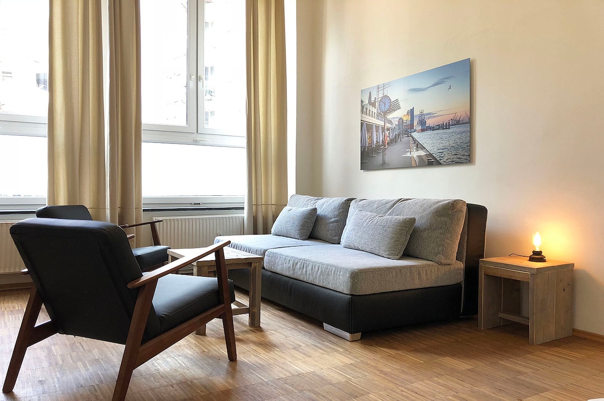 2020年9月新開業。漂亮的公寓,位於滑雪跳躍區邊緣一個安靜的院子裡。入住建於1885年、2020年翻修的Kaufmannsvilla安靜的住宅街道。 舊的肚臂,現代酒店般的傢俱,改良的隔音和設備精良的廚房。步行即可抵達熱門時尚區Sternschanze的許多酒吧和餐廳。適合兒童入住的區域,有很多遊樂場。