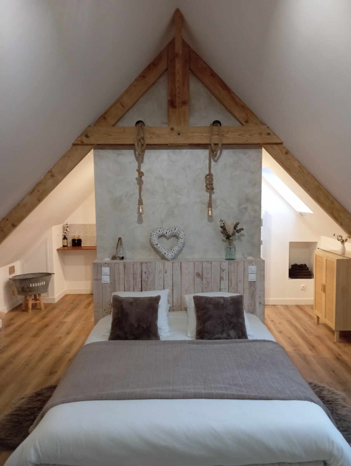 A small love nest in the heart of St-Valery-sur-Somme, the Somme’s bay welcomes couples for a moment of relaxation and peace thanks to its Spa area and a bedroom with a king-size bed. Warmly welcomed , bathrobes and cozy towels will accompany you in the spa area, equipped with a large jacuzzi with 2 massage areas, a Finnish sauna and two separate showers. And more a quality sound system and chromotherapy for the pleasure of the senses.