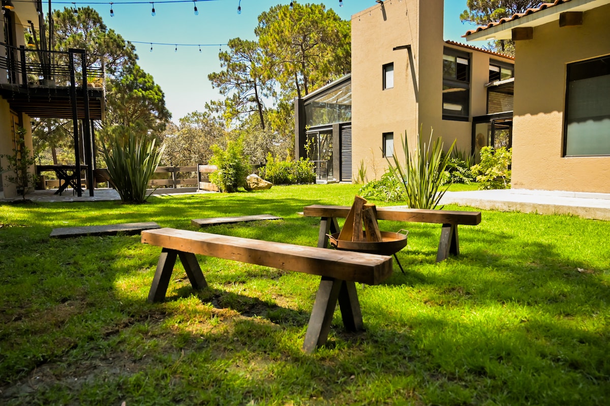 Disfruta Avandaro con todo el confort, privacidad y naturaleza que casa Amelia te ofrece. Una casa diseñada para compartir en familia o amigos, donde puedes pasar momentos agradables en la terraza sintiendo que estás en medio del bosque. El pueblo con sus tiendas y rest está a solo 5 min. El rest y bar del Fishe’s House se encuentra a media cuadra. Disfruta el cantar de los gallos al amanecer, aunque también contamos con tapones para los oídos para los más sensibles.