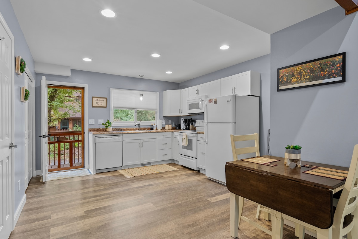 一間美麗的小屋,為我們的房客提供驚人的山景日落。 迷人的有頂門廊和舒適的火桌是欣賞這種風景如畫的阿帕拉契山景的完美之地! 室內設計採用精選的交錯接合木牆和溫暖的拱形結節松木天花板。 裝飾和家具都很舒適,提供溫馨的山間小屋感覺! 明亮、乾淨、設備齊全的廚房,配有石英檯面和不鏽鋼電器。 加上300多MBPS高速WiFi