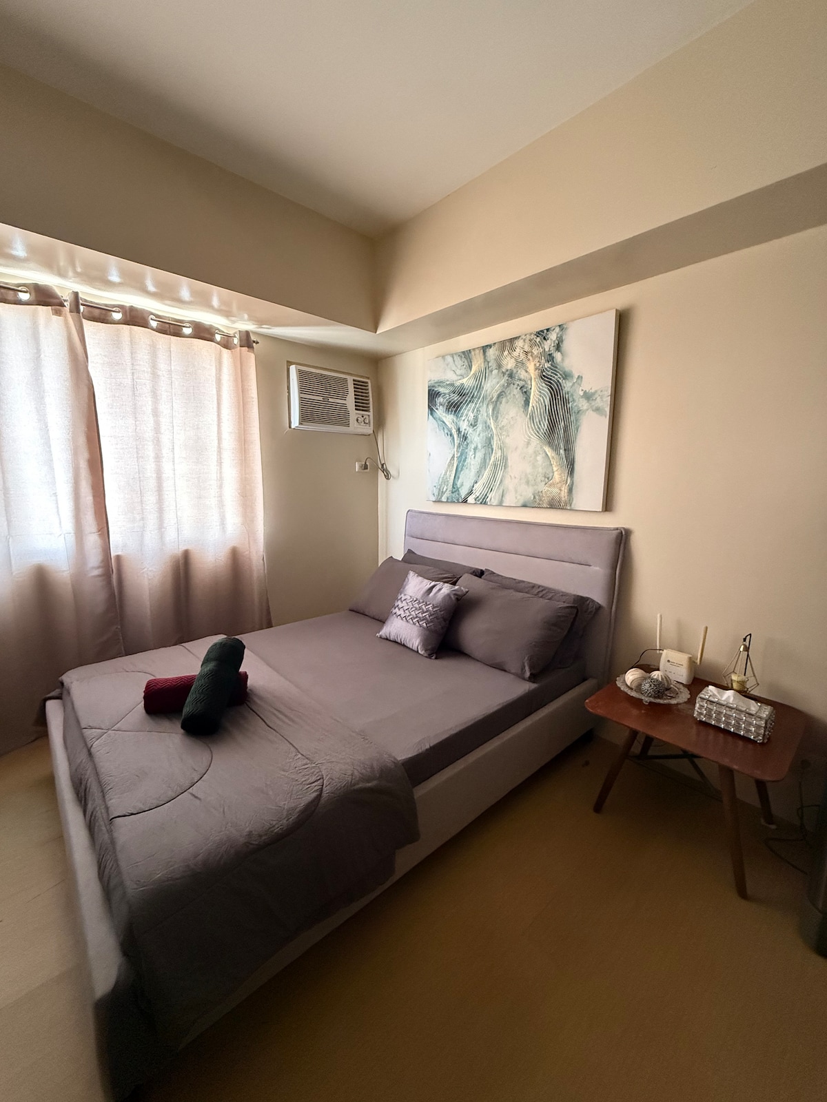配有Netflix的光纖WiFi。 1 間臥室公寓,家具齊全@ Abreeza Place Tower。它位於Ayala Abreeza綜合大樓內,步行1至2分鐘即可抵達Abreeza商場(商店、餐廳,如TGI Fridays、貨幣兌換處、銀行、書店、雜貨店、電影院、咖啡店,如星巴克等)。 這是一個角落單位,餐廳和臥室兩側都有落地窗。有門禁並有 24 小時保全。可供短期或長期出租。