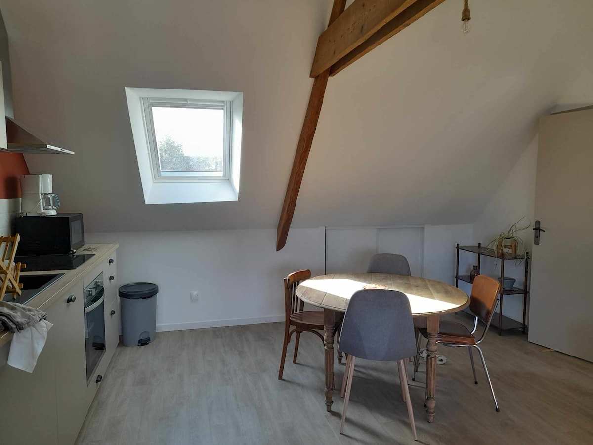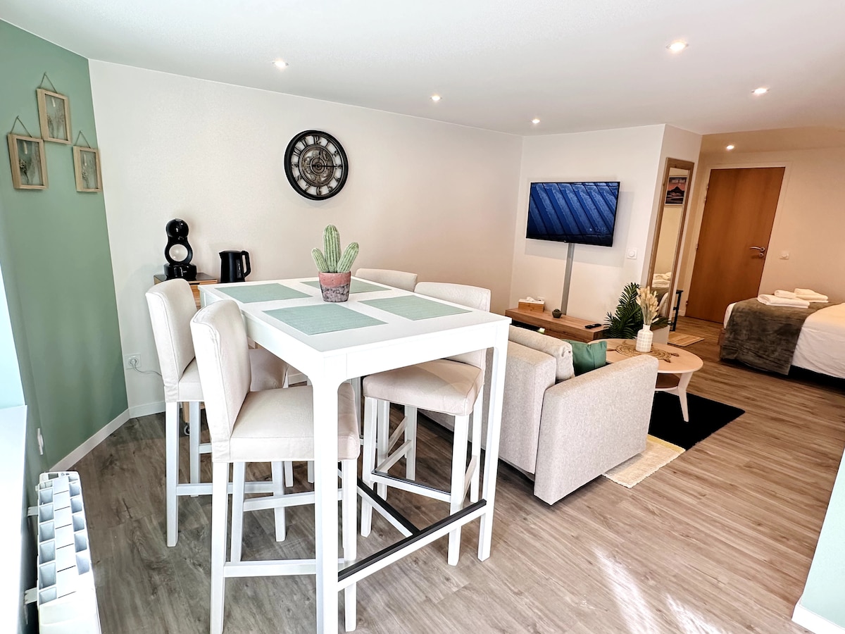 這間 27 平方公尺的單間公寓位於市中心,於 2022 年全面翻新,位於三樓,有電梯。 此住宿非常適合您的商務差旅或情侶來探索該地區。 距離住所不到 300 公尺處,有一家電影院、幾家餐廳、一家每週 7 天營業至晚上 10 點的雜貨店、酒吧、煙草店等。 享受屋頂和教堂鐘樓的美景。
