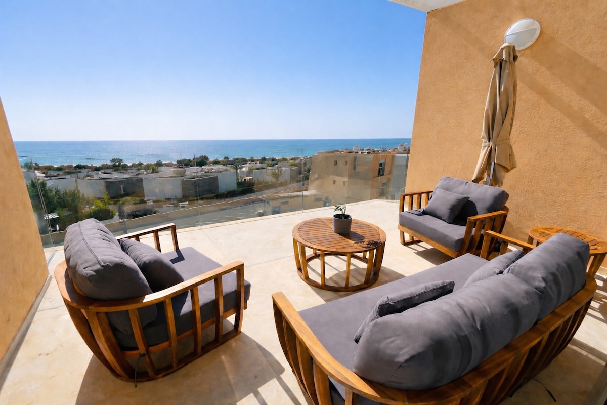 🌴海景公寓–距離海灘僅幾步之遙 明亮、現代化的公寓,可欣賞塔加茲特灣的壯麗海景和高爾夫球場景觀。 非常適合家庭、情侶或衝浪者! 享受泳池、安全的住宅、舒適的起居空間和設備齊全的廚房。 步行即可前往咖啡廳、海灘和當地景點。 立即預訂夢想中的海濱度假勝地!🌊☀️