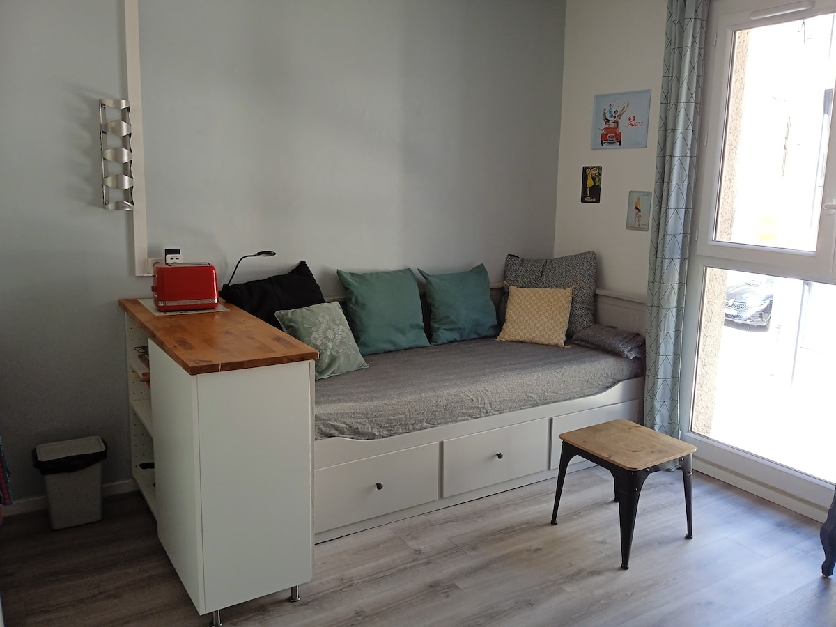 位於一棟安靜的獨立房屋的地板上,有花園和圍欄停車位。 獨立入口、帶馬桶的浴室(提供毛巾)、配備senseo咖啡機的小廚房、微波爐、水槽、冰箱、電磁爐、碗盤、桌子、電視椅(提供洗碗巾)。 臥室包括配有電視的休息區、140公分牀、梳妝臺、託架。 (不提供牀單)可租用牀單10歐元。維護20歐元。不適合8歲以下的兒童入住。