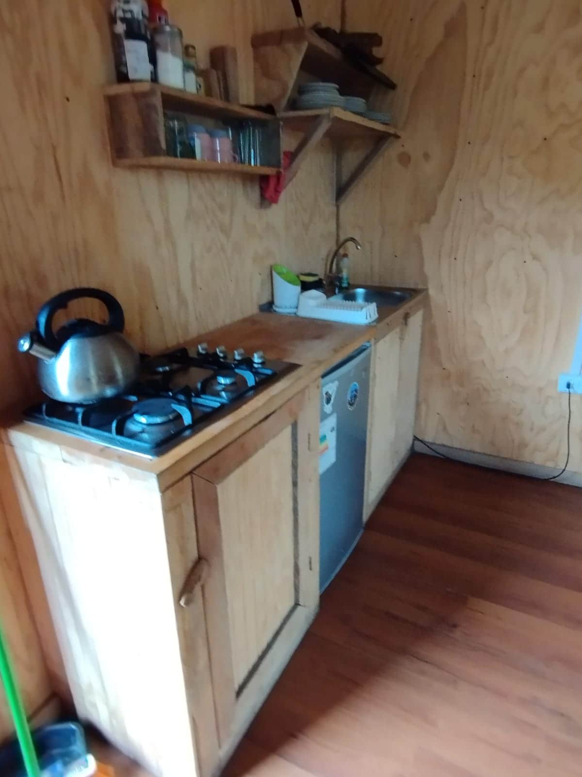 這個統一的空間在單一環境中擁有一切,牀很舒適,所有元素都是由原生木材製成的,其盒子是來自瓜達爾港海灘的瑪瑙石木。 浴室是獨立的,廚房備有迷你吧,是空間的一部分。