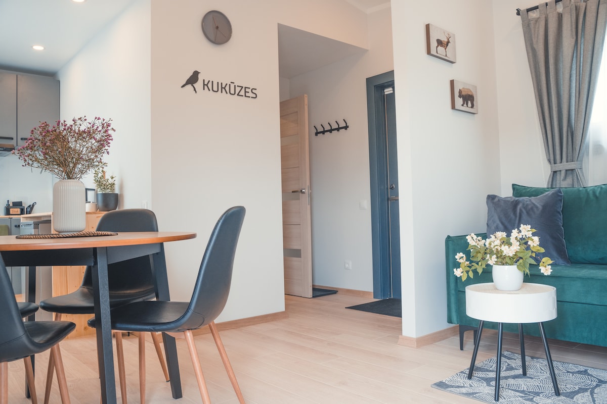 這間新建的公寓有一張加大雙人床。一間客廳,配有廚房和舒適寬敞的沙發。兩間房間均可使用大露臺/陽臺。 有2輛自行車可供使用! 距離海灘500公尺 距離主要步行街 1 公里 距離森林冒險公園100公尺(許多兒童景點) 距離「Dzintari」火車站300公尺(乘車30分鐘即可抵達里加中心) 非常適合想在安全安靜的地方享受海灘、大自然和睡覺的情侶和小家庭。