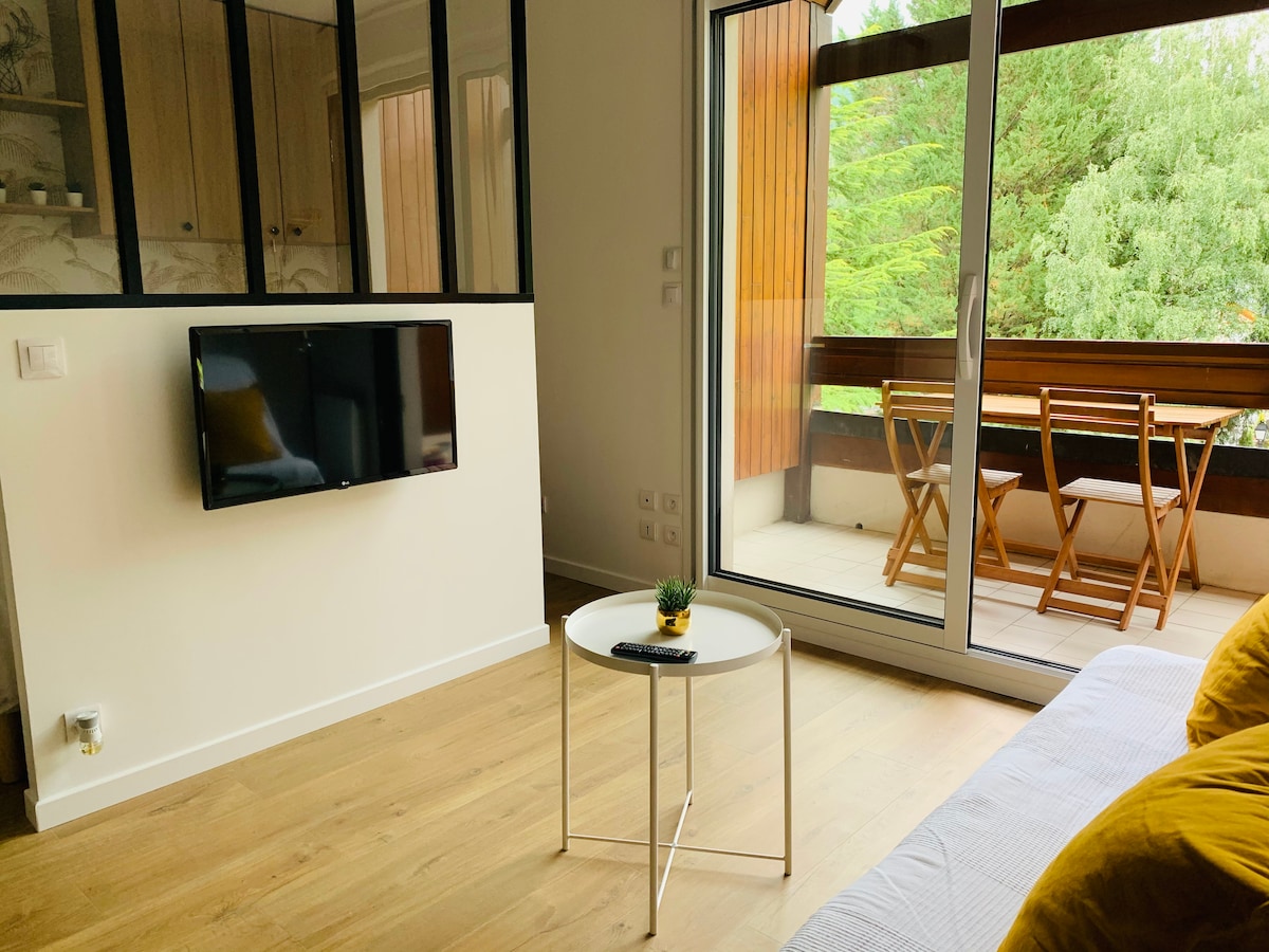 市中心, 28平方公尺的T1bis ,位於一樓,溫泉浴場前有電梯,距離Etigny小巷和纜車2步之遙。 您可以步行前往任何事情! 設備齊全,備有電器、碗盤。 獨立廁所、衣櫃、臥室配有140床。平面電視 非常安靜,公寓和陽臺可俯瞰死胡同,沒有交通堵塞。 免費路邊停車位。 可以在大樓的庭院內停放摩托車。