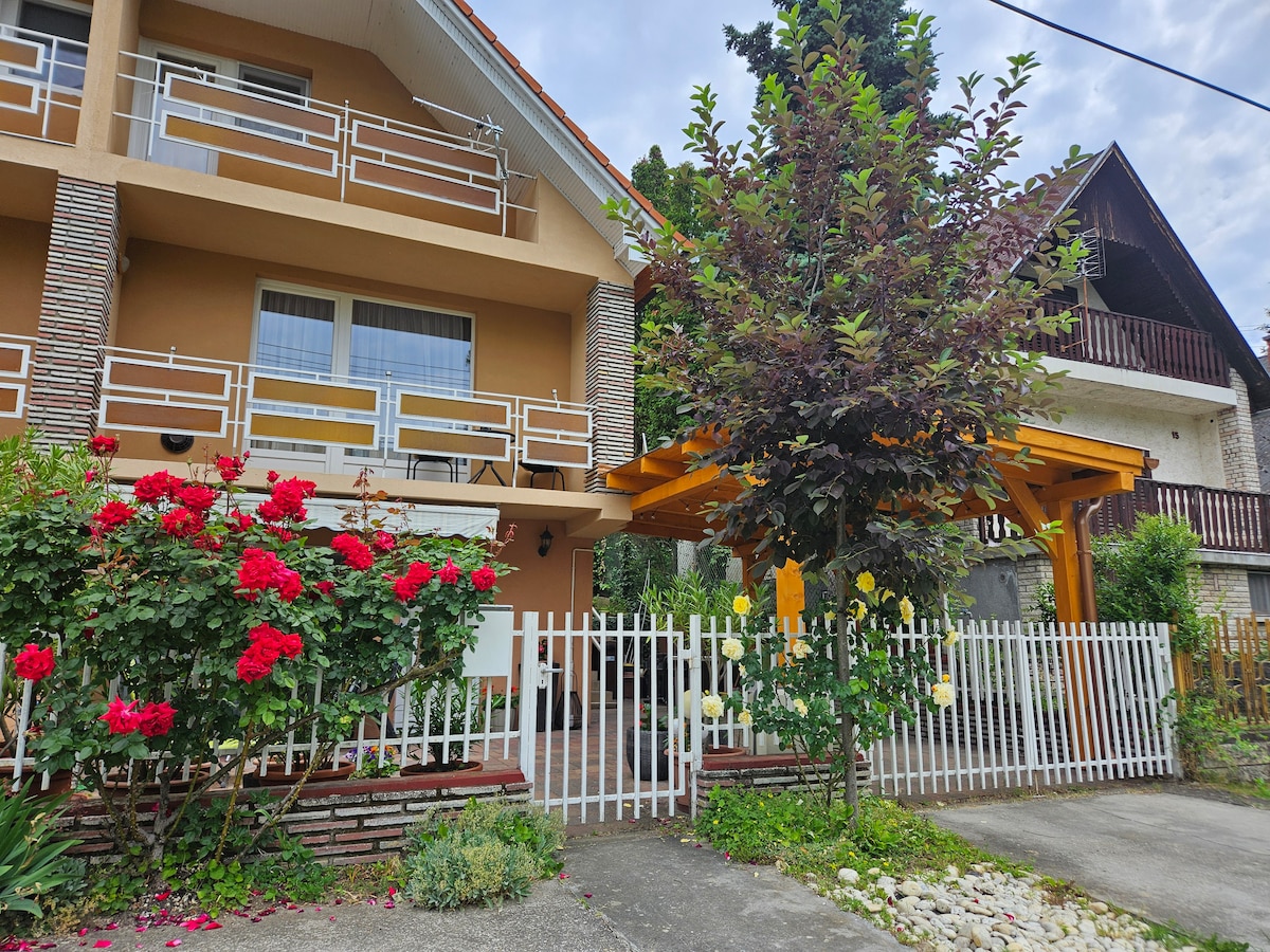 Where should we start…With the deer in front of the Blue House? With the Rose Garden? With the Pergola after which ¨A Lugas¨ has been named? Or the breath- taking view? We are offering two bedrooms, 2 bathrooms, living room&kitchen and private terrace in a 6,000 m2 rural garden with fruit and nut trees, rose and grape pergolas with amazing view of the Balaton, 20 minutes on foot from the lake on top of a mountain. 4+2 guest We are happy to host your pets also but only with prior consultation.