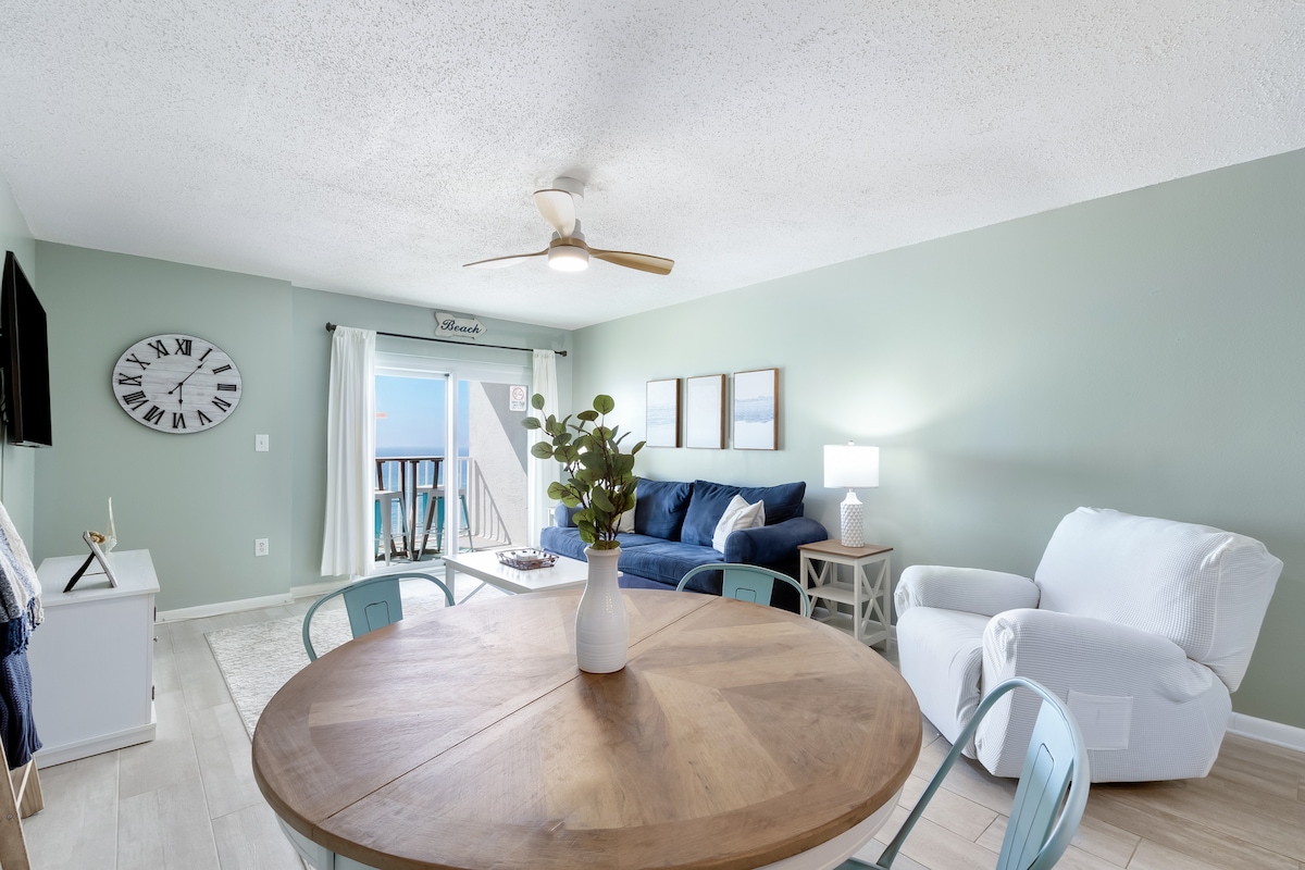 令人嘆為觀止的景色與優越的地理位置相遇。享受: -令人驚嘆的私人陽臺,可欣賞一覽無遺的海灣景觀。 -離開您的單位並前往海灘。 -預訂包含免費泊車位(價值30美元!)。 -1間加大雙人牀臥室+內置上下舖+標準雙人沙發牀。 -海灘上的私人泳池。 -位於海灣海岸( Gulf Shores )的中心,步行即可抵達The Hangout等地。 -全新翻修的單位! -「房客最喜歡」的所有Airbnb房源排名前5% !